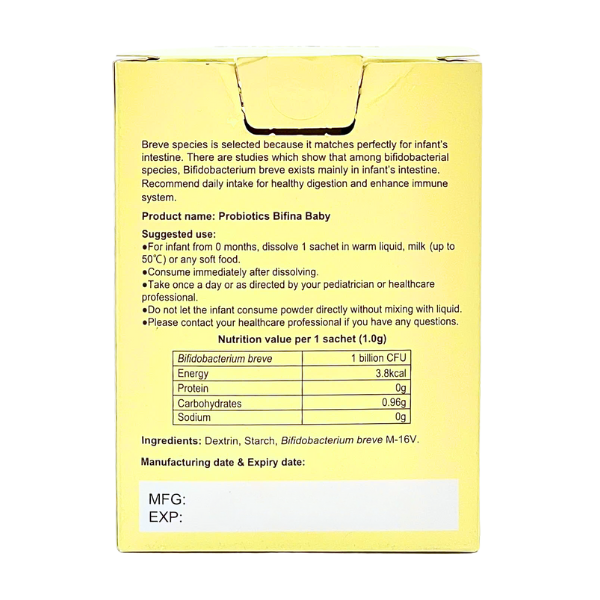 Trong 1 gói (1g) chứa: Bifidobacterium Breve M-16V: 10^9 CFU. Phụ liệu: Dextrin, Tỉnh bột.