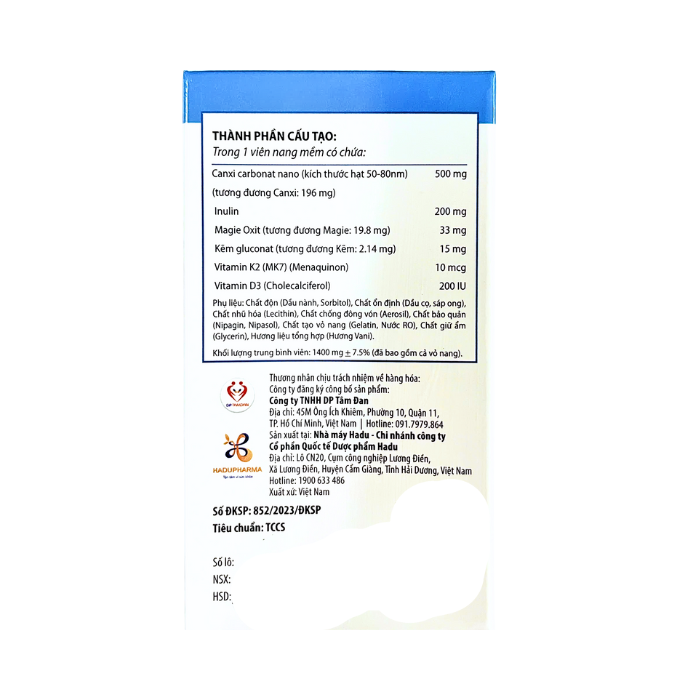 - Canxi carbonat nano (kích thước hạt 50-80nm): 500 mg