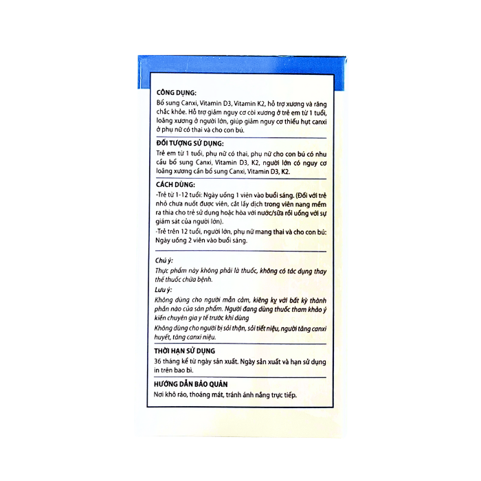 - Bổ sung canxi, Vitamin D3, Vitamin K2, hỗ trợ xương và răng chắc khỏe.